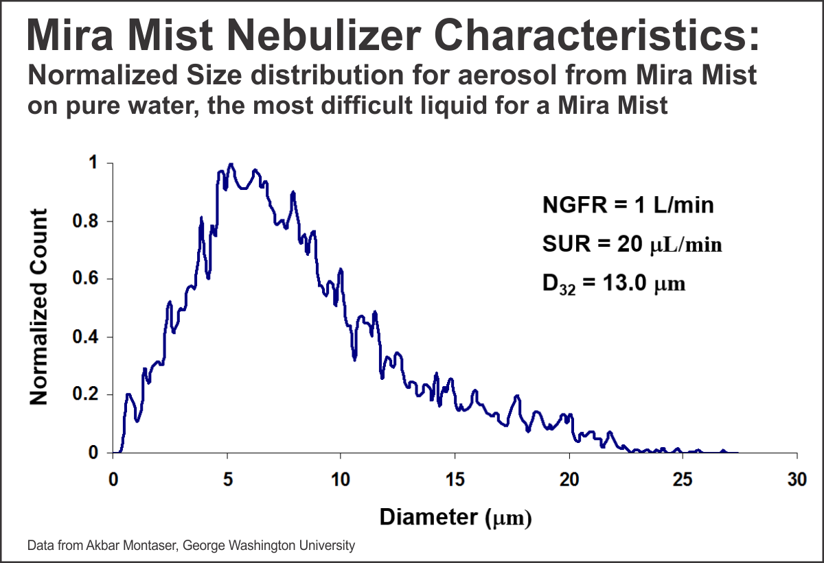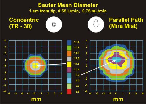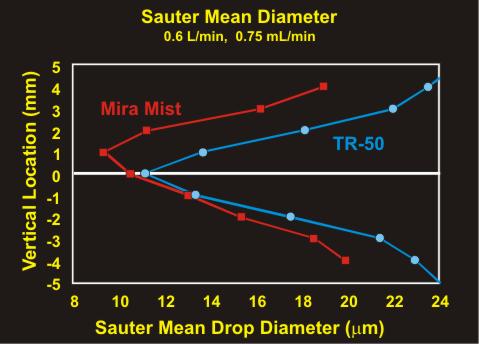 Smaller is Better! Droplet size is very important in analytical and many other applications. For ICP and ICP/MS instruments, the droplet size determines both how much travels to the torch, and also how quickly the droplets vaporize in the plasma. The stability and intensity of the results improves significantly as the drops vaporize more quickly. Data from work by Akbar Montaser, of George Washington University and by John Olesik, of Ohio State University show the smaller droplet sizes of the Mira Mist compared to a standard Glass Concentric nebulizer.
