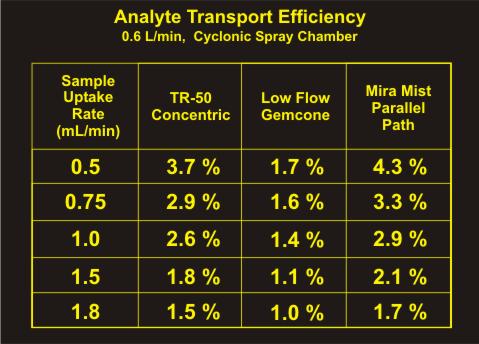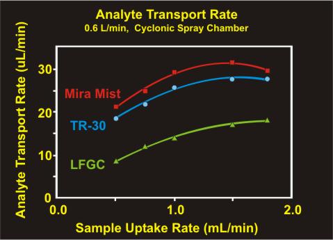 Greater Sample Transport! With smaller droplets, the vaporization is faster which improves the stability and sensitivity. It also can increase the amount of sample that is delivered to the torch. As the intensity and sensitivity of the instrument is directly related to the number of atoms in the plasma, higher transport rates improve the sensitivity as long as the droplets are small enough to easily vaporize. With the Mira Mist nebulizers, both factors are present: smaller droplets (as shown above) and higher transport rates as shown by the following comparison data from work by John Olesik, of Ohio State University: