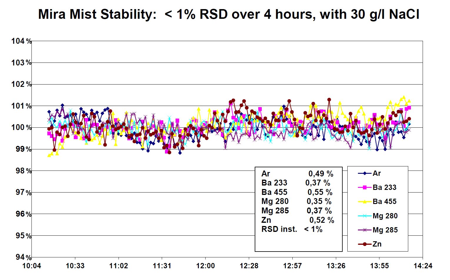 Phenomenal Stability! Smaller drop sizes is one benefit, but without consistency, it does not help. The Enhanced Parallel Path method allows a smooth, continuous flow of the liquid into the gas stream, pretty well regardless of how much liquid is flowing. For smaller flows, the spout needs to be more exactly made, but the method is the same for tiny or great flows. Data from many tests show the benefits of the method. Following is a graph produced by Nathalie Le Corre, of JY Horiba, France. The test was run on a PEEK Mira Mist with 3% NaCl solution, for over 4 hours. In this test, the %RSD variation is always less than 1%. In comparison, most nebulizers are glass concentrics, and they generally plug up as the salts precipitate in the gas orifice. Typically a glass nebulizer will be unable to run 3% salt for more than an hour without plugging up totally, and they always drift badly as the salts form. To run for 4 hours without any drift, nor any loss in sensitivity, and to be able to maintain less than 1% RSD is unheard of with other nebulizers. | |||||