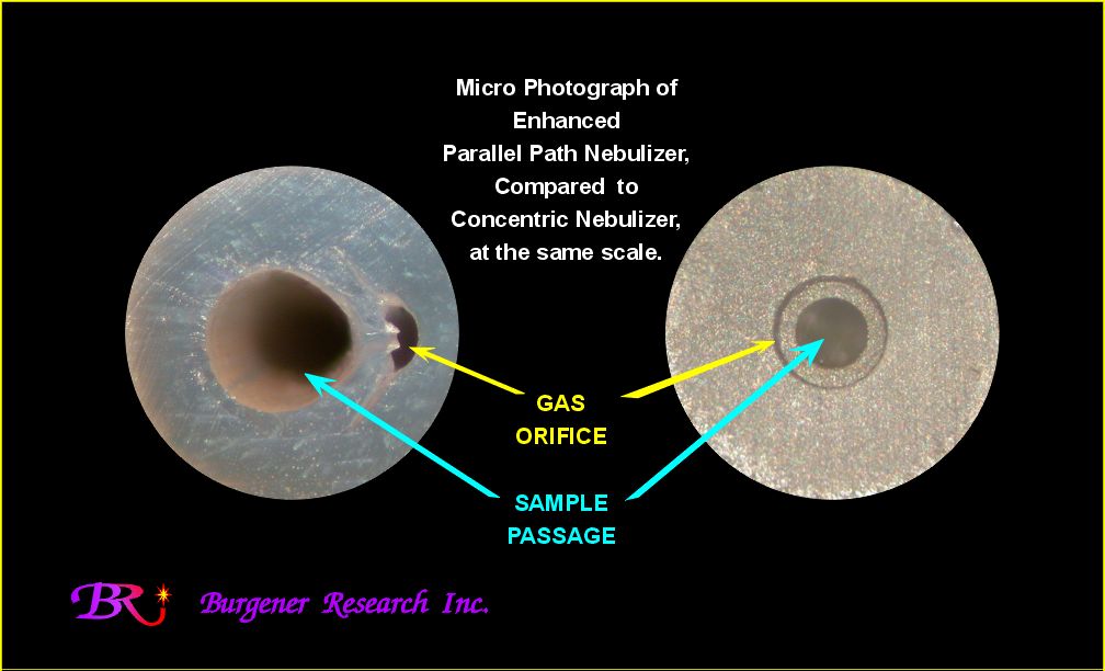 Here is a comparison of a Burgener Enhanced Parallel Path nebulizer tip with a concentric nebulizer tip: