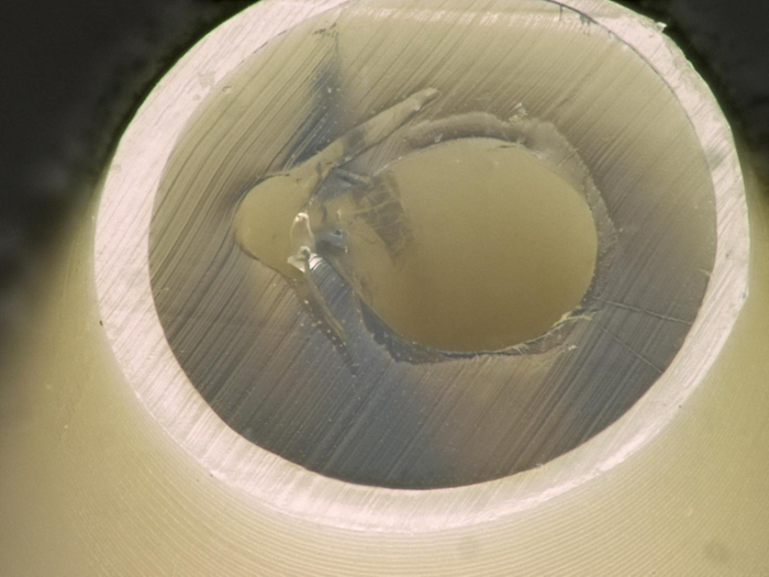 Note that the gas orifice on the Enhanced Parallel Path Nebulizer is very much larger than the gas orifice on the concentric. Any salts forming on the concentric will easily plug part of the orifice. Any salts forming in the parallel path orifice have to be very large to have any effect on the gas flow, and usually such salts simply blow away. Also note that the Enhanced Parallel Path design has a gas orifice is actually circular, and the path you see in the photographs is a spout that dips into the middle of the gas stream much like a tea-pot spout. The surface tension of the liquid fills the end of the liquid passage and also the spout, so that the liquid is touching the gas stream, and interacting directly with the center area of the gas stream. |
